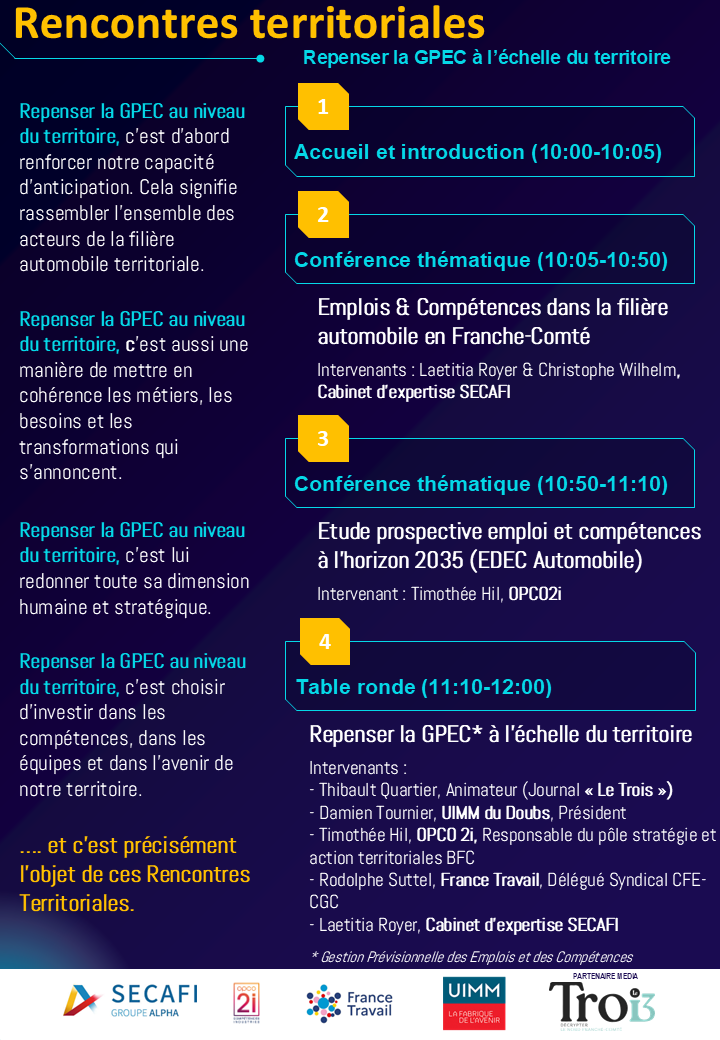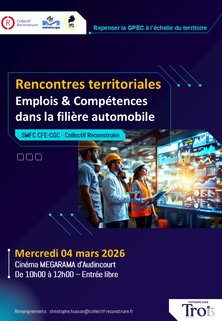 Les "Rencontres Territoriales Emplois & Compétences" (04 mars 2026) de la CFE-CGC visent à repenser la GPEC (Gestion Prévisionelle des Emplois et Compétences) à l'échelle du territoire en réunissants experts, acteurs de la filière automobile et partenaires institutionnels.