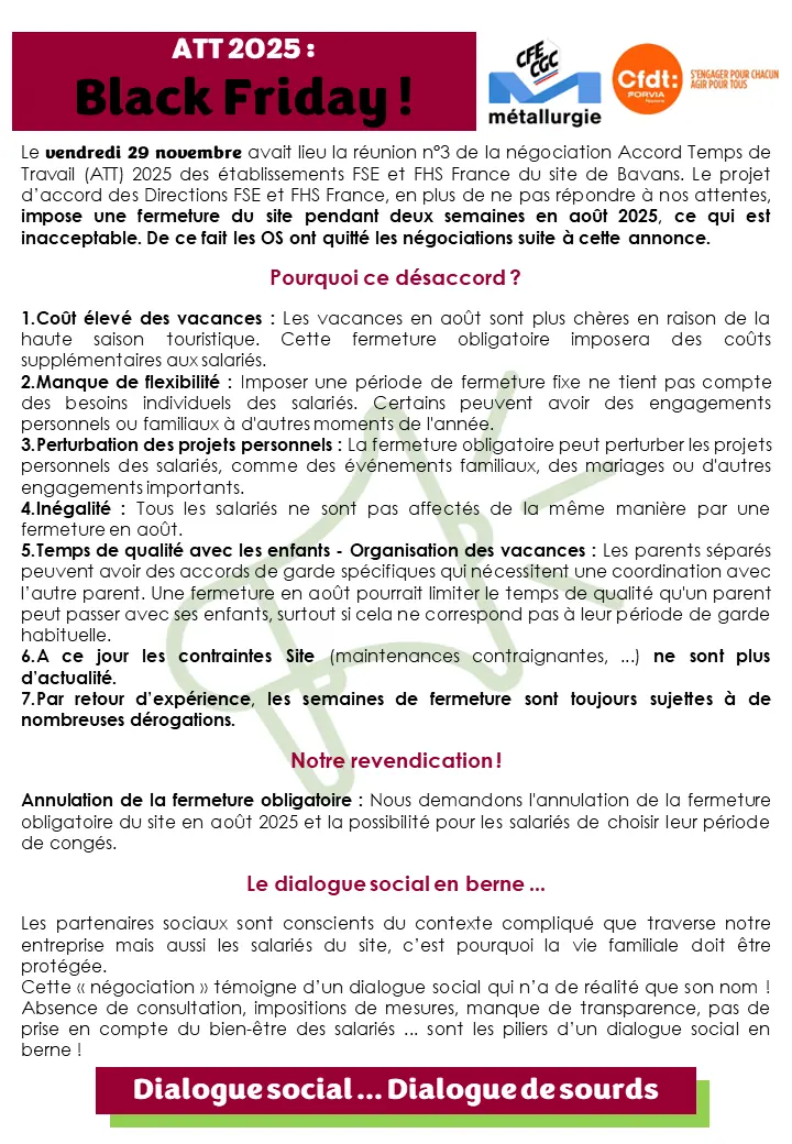 Le vendredi 29 novembre avait lieu la réunion n°3 de la négociation Accord Temps de Travail (ATT) 2025 des établissements FSE et FHS France du site de Bavans. Le projet d’accord des Directions FSE et FHS France, en plus de ne pas répondre à nos attentes, impose une fermeture du site pendant deux semaines en août 2025, ce qui est inacceptable. De ce fait les OS ont quitté les négociations suite à cette annonce.